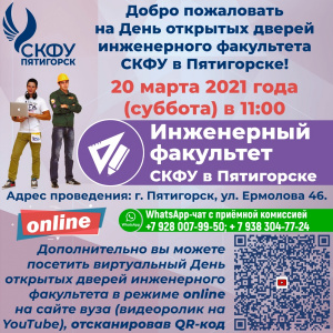 19.03.2021Филиал Северо-Кавказского федерального университета в г. Пятигорске приглашает выпускников школ на День открытых дверей инженерного факультета, который состоится 20 марта (суббота) в 11:00 по адресу: г. Пятигорск, ул. Ермолова 46.