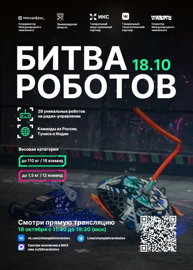 14.10.202518 октября 2025 г. с 11:30 до 19:30 (по местному времени) пройдеттретий отборочный этап Международногочемпионата по битве роботов сезона 2025 года. Ссылка на прямую трансляциюЧемпионата в сети «Интернет» по адресуhttps://vkvideo.ru/video-219465931_456240922.Подключайтесь к просмотру - это будет захватывающе!
